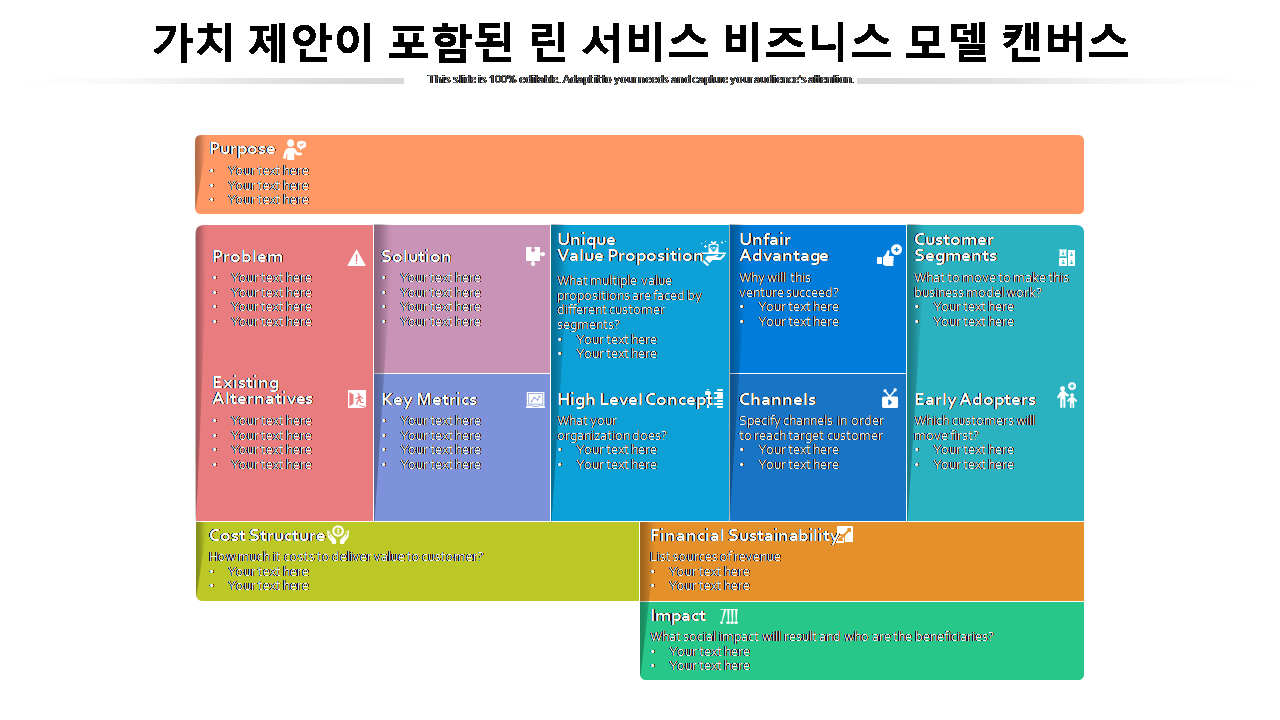 - 린 캔버스: 린 스타트업 방법론에 기반하여 아이디어의 빠른 검증과 개선에 초점을 맞춥니다. 불확실성이 높은 초기 단계의 스타트업에게 유용하며, 핵심 가설을 명확히 하고 고객 피드백을 통해 빠르게 학습하는 데 도움을 줍니다.